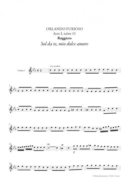 Sol da te mio dolce amor (Ruggiero, I, 11), which is the subject of this publication, is an enchanting largo written for traverse flute, muted violins, violas and pizzicati bass, with the exception of one violone con l'arco and without harpsichord. Entrusted to the character of Ruggiero, Orlando?s companion and Bradamante?s lover, this aria is a declaration of love wrested from him by Alcina so she can cast a spell on the noble knight. The long flute solo that introduces the aria brings to light an instrument completely new to Venice at that time, and appearing for the first time in one of Vivaldi?s operas. The sumptuous vocal line given to the alto bears witness to the talent of its original performer, the castrato Giovanni Andrea Tassi.