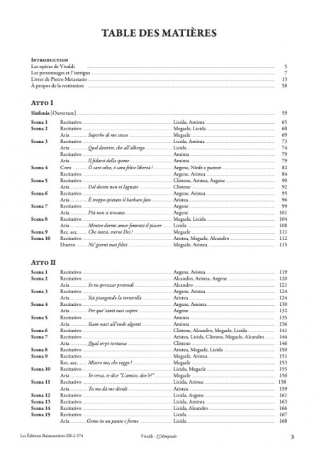 Après moult rebondissements dramatiques, Licida est pardonné et Aristea convole en justes noces avec Megacle. ”Le livret sert de prétexte à un formidable débordement mélodique où rivalisent amitiés trahies et amours contrariées. L’Olimpiade est l’une des plus belles compositions de Vivaldi. L’écriture musicale, constamment renouvelée, sait tirer parti, avec bonheur, de la grande variété des situations dramatiques. Les arias liées aux affetti de l’âme des différents personnages sont superbes, merveilleusement mises en musique dans un style mélodique extrêmement riche et foisonnant de couleurs.”
