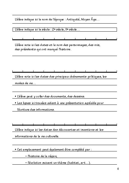 L'élève y note les dates, le nom de l'époque, les noms importants, les événements politiques, les modes de vie, les découvertes et la vie culturelle...