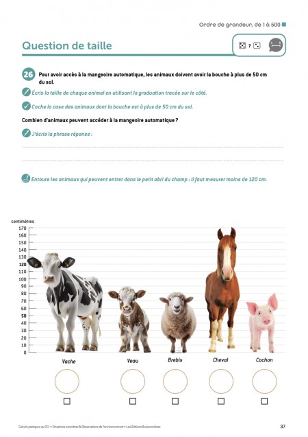 Au-delà, un objectif pédagogique global ambitieux : aider chaque élève à se rendre compte de ce que représente le nombre. La réalisation de ces fiches contribue à lui donner des références utiles toute la vie : la taille ou la température du corps humain et des animaux, le nombre de battements de coeur, le nombre d’instruments dans un orchestre…